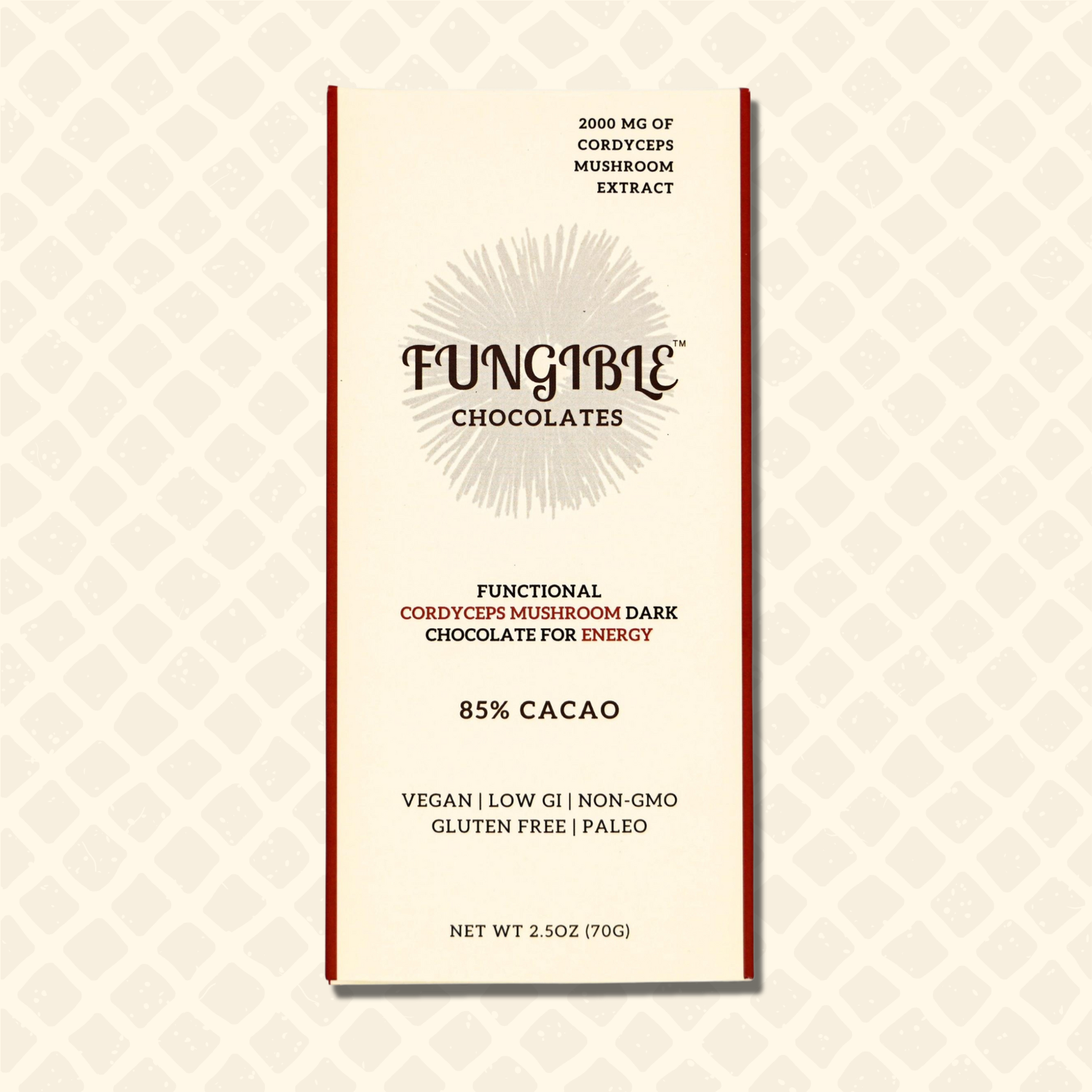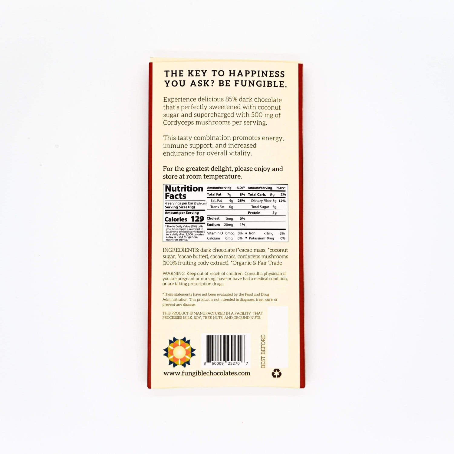 Experience delicious 85% dark chocolate that's perfectly sweetened with coconut sugar and supercharged with 500mg of Cordyceps mushroom extract per serving (4 servings per bar) with no mushroom taste.